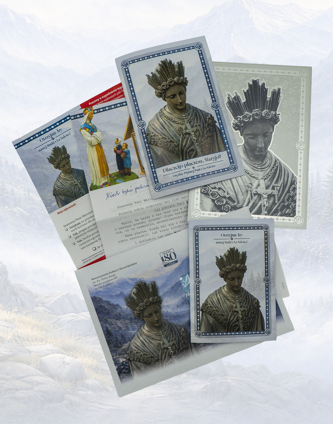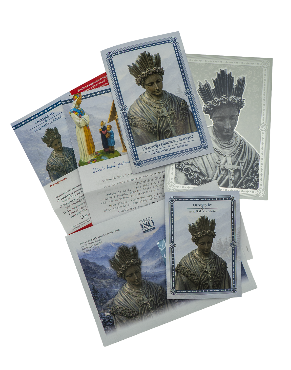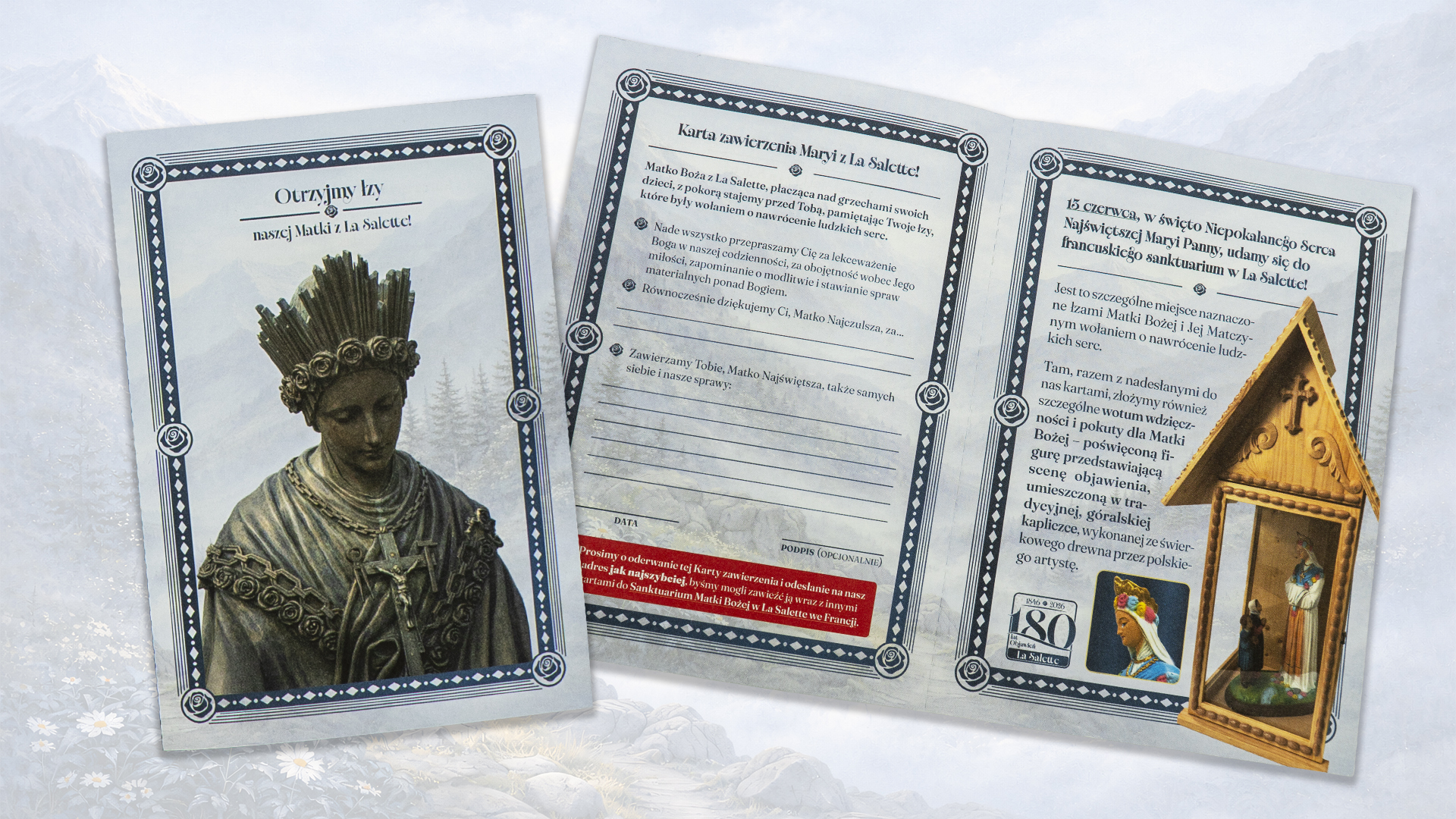 Do pakietu dołączona jest również ilustrowana broszura, która w przystępny sposób przybliża historię Objawień w La Salette i ich duchowe znaczenie, a także specjalna karta zawierzenia Matce Bożej, na której możesz zapisać swoje podziękowania i prośby – jako osobistą odpowiedź serca na Jej matczyne wołanie.