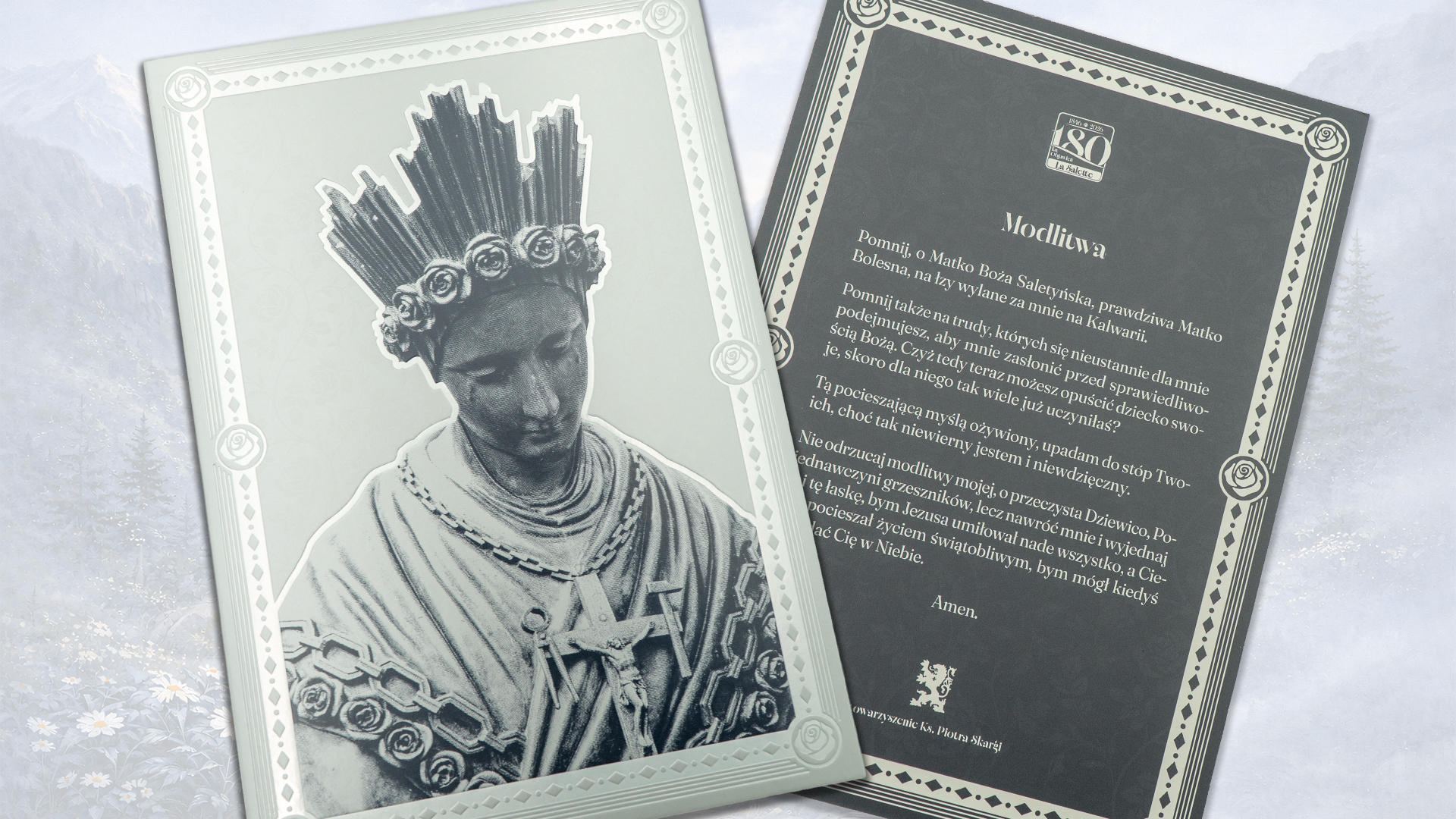 Otrzymasz pięknie zdobiony obrazek z wizerunkiem Matki Bożej z La Salette i modlitwą na odwrocie. Może on zająć szczególne miejsce w Twoim domu i przypominać o matczynych łzach Maryi oraz Jej wezwaniu do przemiany serca.