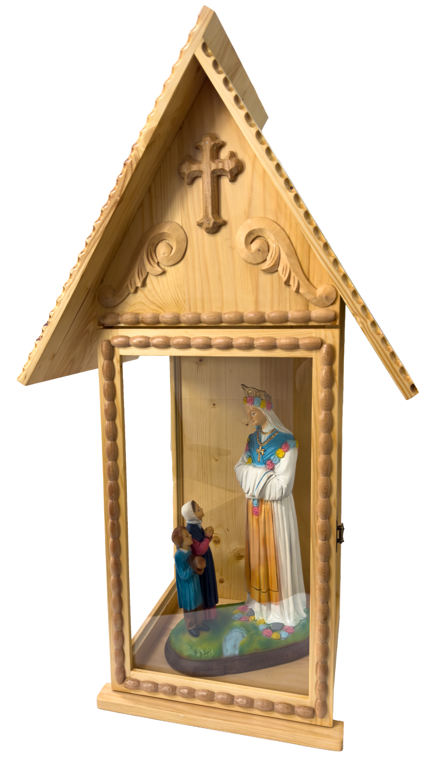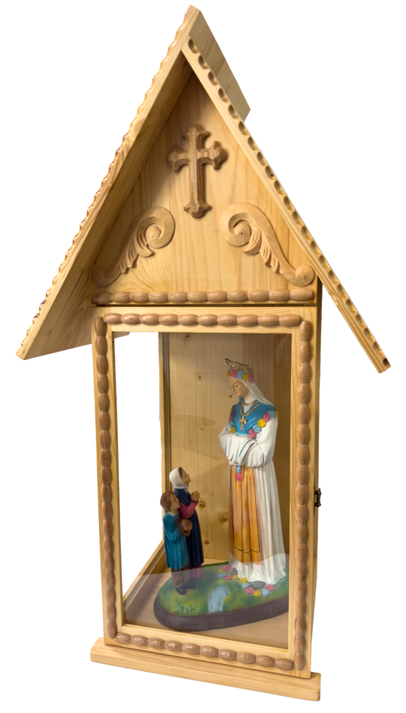 To poświęcona figura przedstawiająca scenę Objawienia Maryi we francuskim stroju ludowym z La Salette, umieszczona w tradycyjnej, polskiej góralskiej kapliczce.